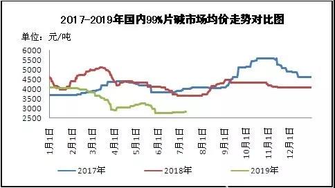 圖1 2017-2019年國內(nèi)99%片堿市場均價(jià)走勢對(duì)比圖