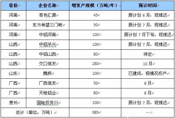 表1 2019年國內(nèi)氧化鋁增復(fù)產(chǎn)統(tǒng)計(jì)(數(shù)據(jù)來源:東證期貨)